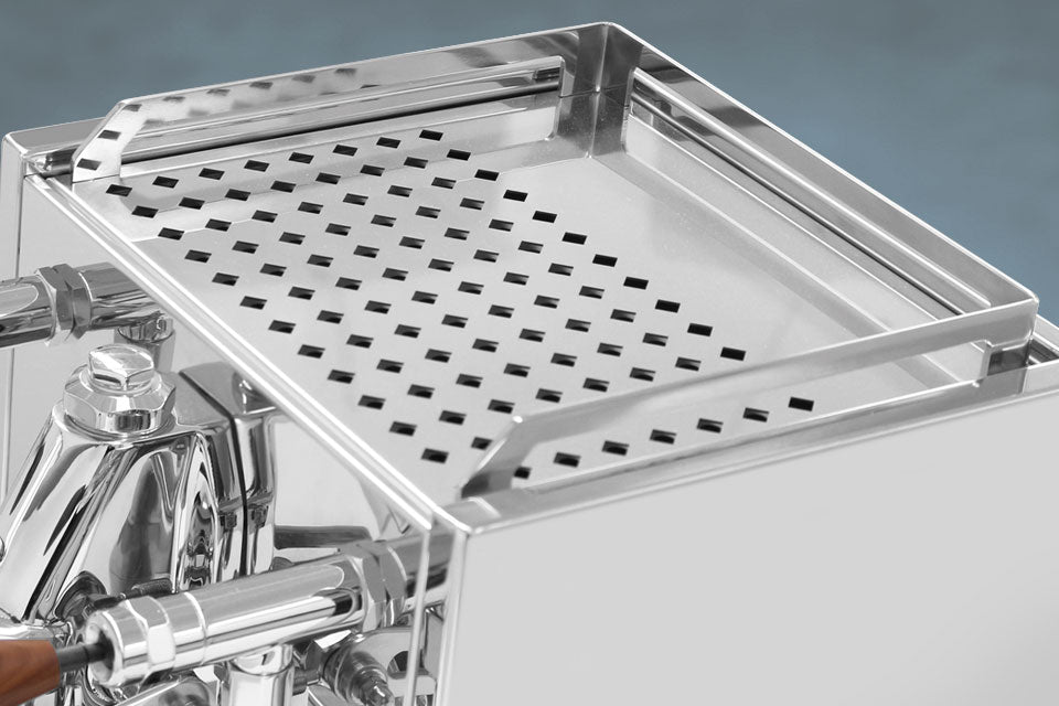 Telaio in acciaio inox, piedini in alluminio lucidato, ampio scaldatazze e pratica vaschetta raccogligocce.