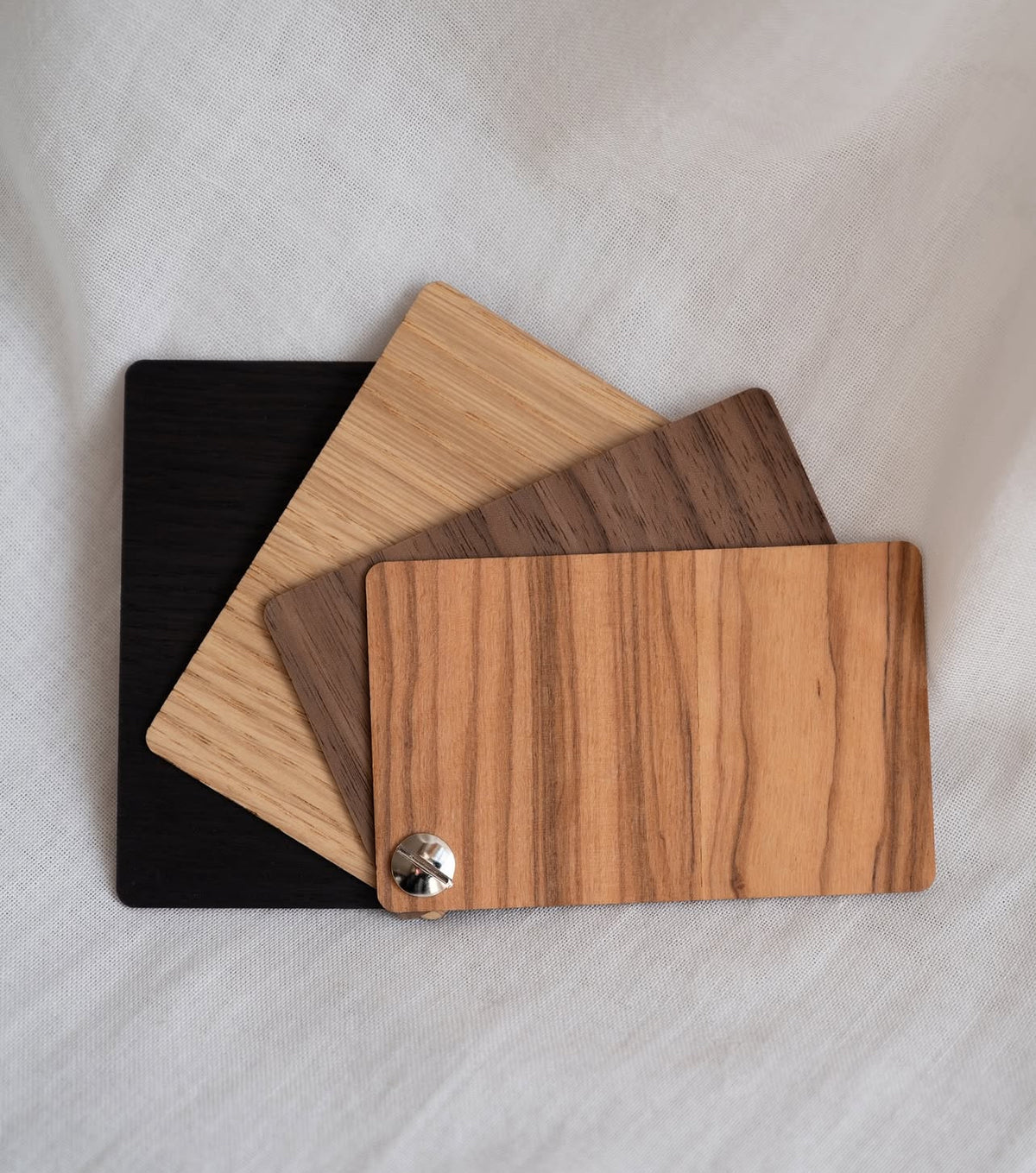 I campioni sono sottili, trattati con lo stesso olio naturale che utilizziamo nei nostri prodotti finiti e assemblati con una pratica vite in metallo.