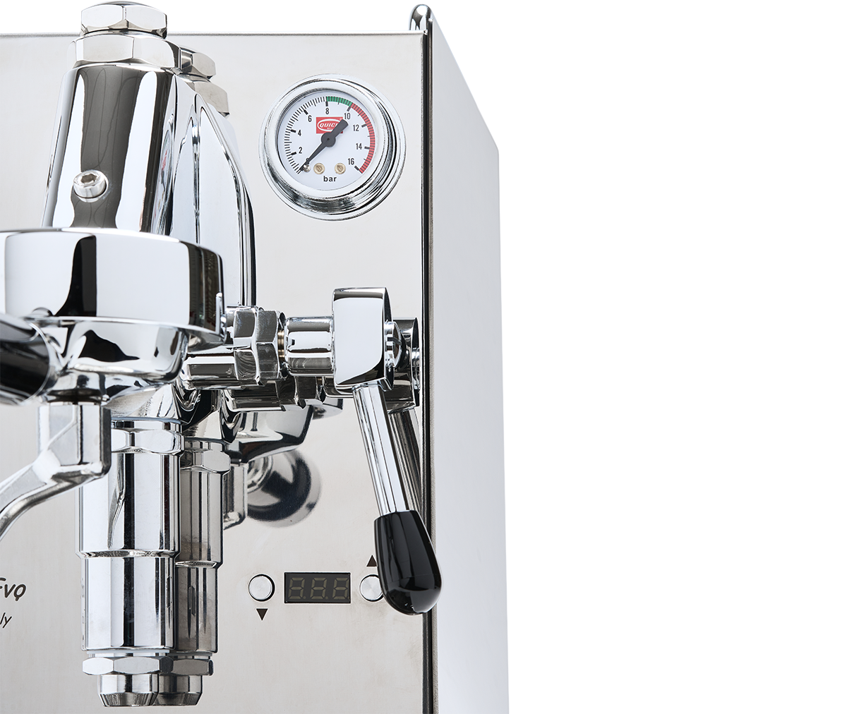 Il display integrato mostra temperatura, timer dell’estrazione, livello dell’acqua e impostazioni. Il manometro (0–16 bar) e le classiche leve rendono l’uso intuitivo e preciso.