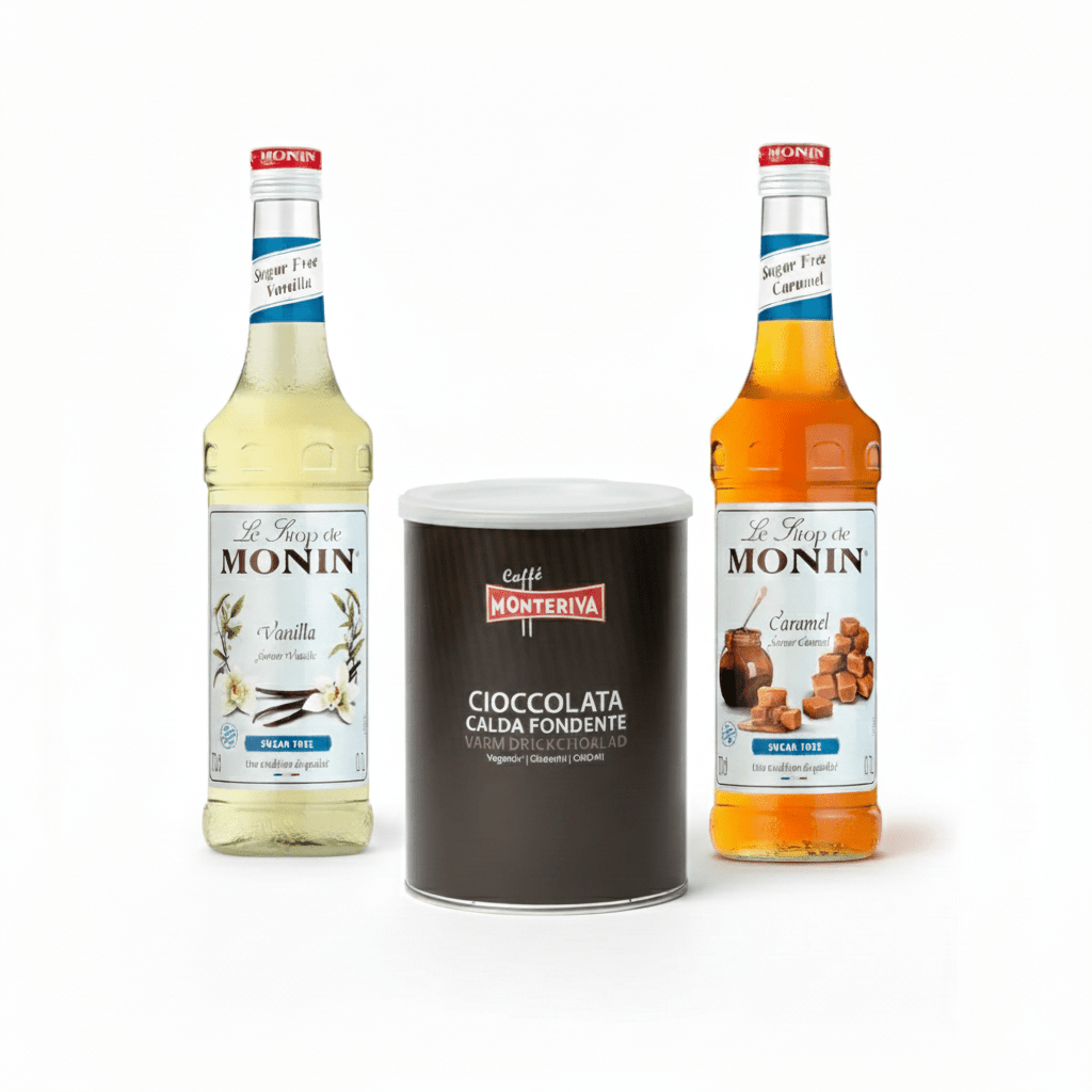 Santa's Sweet Trio combina tutto ciò di cui hai bisogno per creare bevande calde di lusso a casa. Questo pacchetto contiene tre prodotti premium che insieme ti offrono infinite possibilità per gustare cioccolata calda italiana, caffè aromatizzato e varianti creative di mocha.